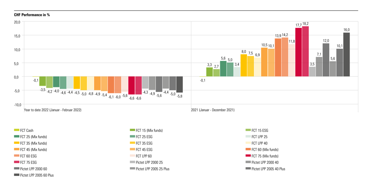 Die aktuelle Lage zeigt sich gegenteilig zur Situation per Ende 2021. Trotz der COVID-19-Pandemie verzeichnete das Jahr 2021 ein aussergewöhnliches Resultat dank der Entwicklung an den Aktienmärkten im letzten Quartal. Auch Immobilienanlagen wiesen 2021 ein positives Ergebnis auf, während die Obligationenmärke das Jahr leicht negativ abschlossen. Das Jahr 2021 bot somit je nach der von unseren Versicherten gewählten Strategie eine Performance in einer Bandbreite von 2,7 % für die Strategie «FCT 15 ESG» bis zu 18,2 % für die Strategie «FCT 75 ESG». Die mit ESG klassifizierten Anlagestrategien gehen zudem einher mit einem verantwortungsvolleren Investieren in Umwelt, Soziales und Governance. Die Grafik zeigt deutlich, dass die Gewinne, die 2021 durch die Strategien mit hohen Aktienanteilen erzielt wurden, die bis Ende Februar 2022 erfahrenen Verluste übersteigen.