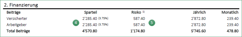 Mit diesen Beiträgen wird nicht nur das Sparguthaben für Ihre zukünftige Altersrente finanziert, sondern auch die Versicherungsprämien für die Risiken Tod (Hinterlassenenleistungen) und Invalidität (Invalidenrente) (5). Dank dem Leistungsausweis behalten Sie jederzeit den Überblick über die verschiedenen - vom Arbeitgeber und von Ihnen, dem/der Versicherten, einbezahlten Beträge, aufgeschlüsselt nach Spar- und Risikoteil. Diese Beträge sind für die Berechnung der verschiedenen Leistungen von grundlegender Bedeutung.