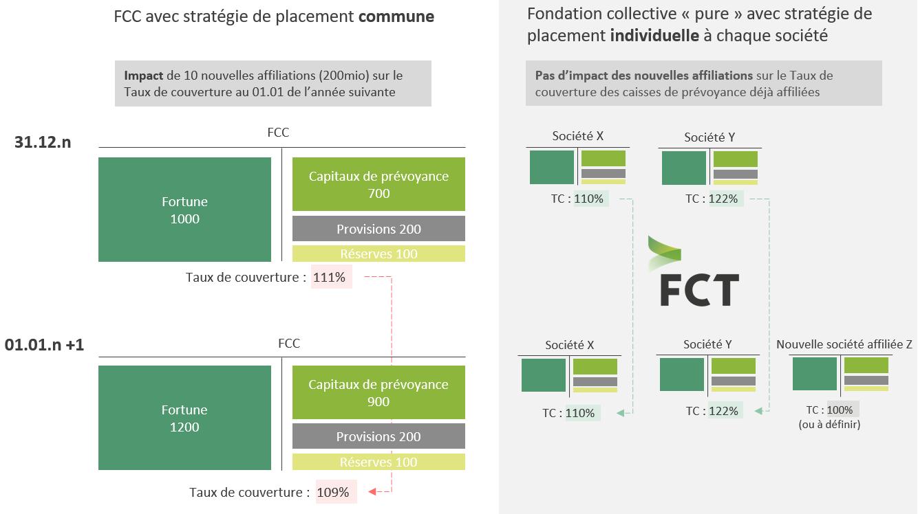 Les tableaux ci-dessous comparent le mécanisme de l’effet de dilution lors de l’affiliation de nouvelles sociétés auprès de FCC avec une stratégie de placement commune ou auprès d’une fondation collective « pure » avec une stratégie de placement individuelle (modèle FCT) :